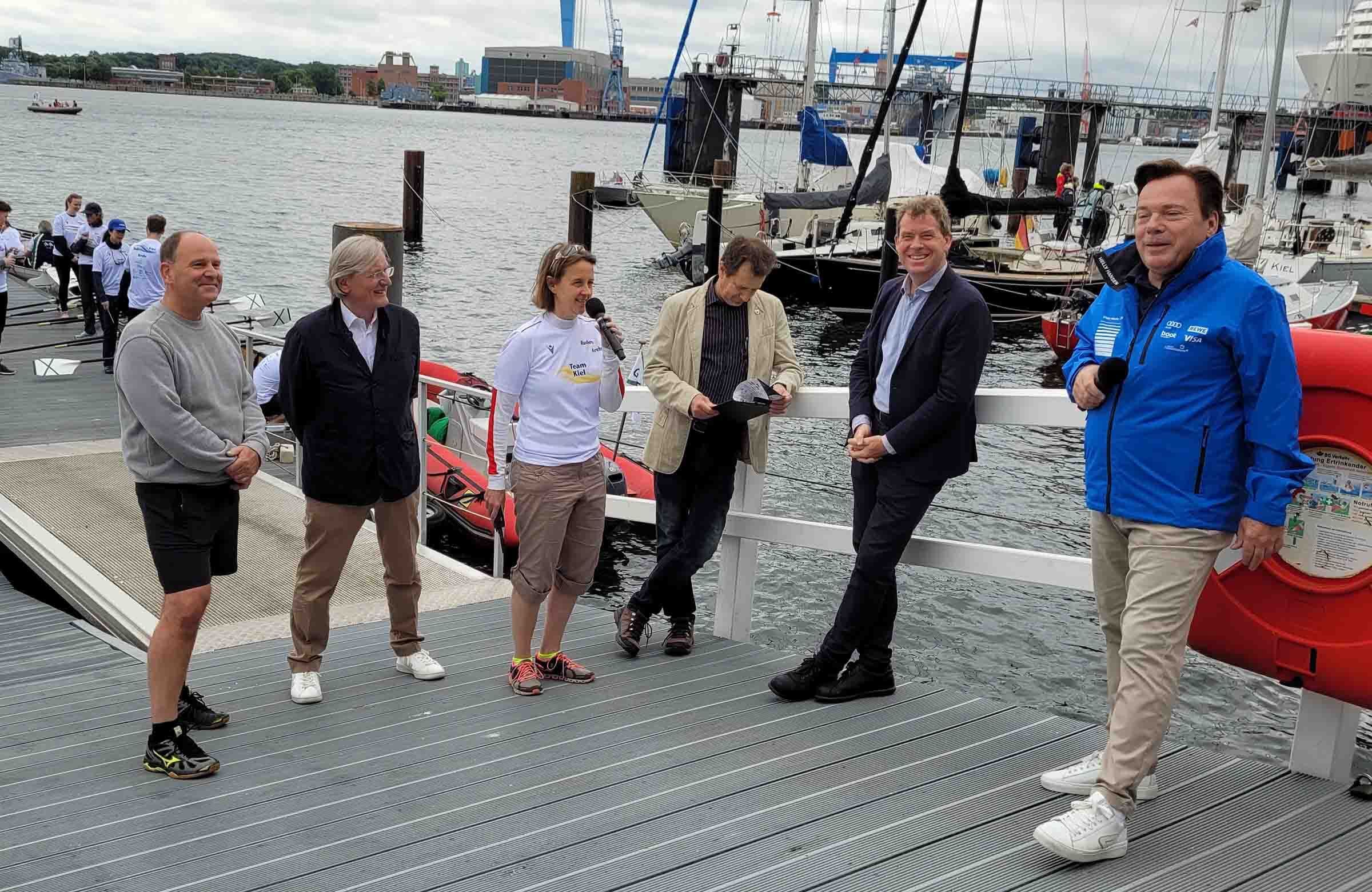 Mit eher durchwachsenem Wetter, aber deutlich besser als jede Wetterprognose vorhergesagt hatte, mussten die Ruder*innen bei der 14. Benefizregatta „Rudern gegen Krebs“ am Samstag zurechtkommen. Aber die Freude auf dieses Sportevent und beste Stimmung sorgten für eine rundum gelungene Veranstaltung. Kooperationspartner des Städtischen Krankenhauses Kiel und der Stiftung Leben mit Krebs sind der Erste Kieler Ruderclub von 1862 e.V., die Rudergesellschaft Germania vom 1882 e.V. sowie der Verband der Kieler Schüler Rudervereine. OB Dr. Ulf Kämpfer eröffnete mit SKK-Geschäftsführer Dr. Roland Ventzke und Claus Feucht, Stiftung Leben mit Krebs, um 10 Uhr den Wettbewerb.