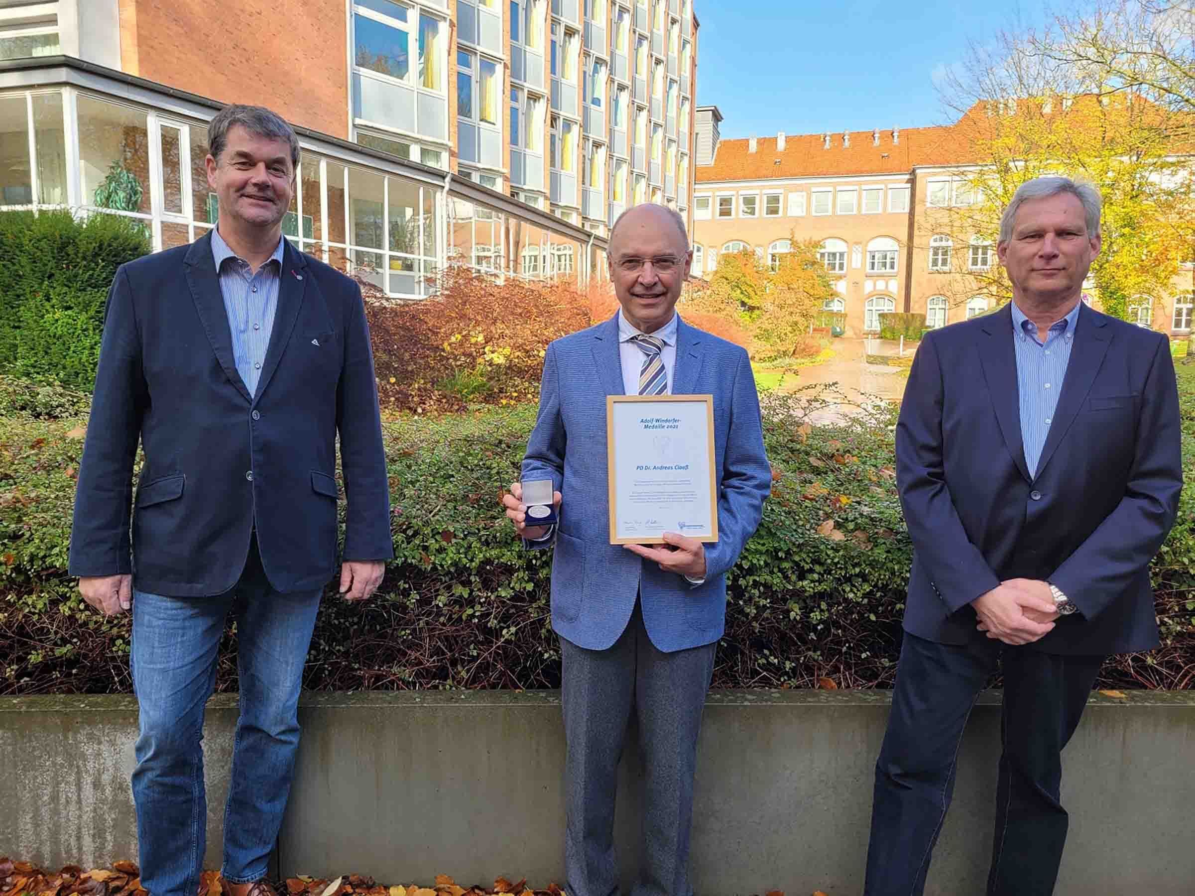Foto: Adolf Windorfer Medaille für den ehemaligen Chefarzt der SKK Kinderklinik PD Dr. Andreas Claaß (Mitte), links Winfried Klümpen, Geschäftsführer Bundesverband Mukoviszidose e.V.; rechts Dr. Gerd Eißing, Mitglied im Bundesvorstand Mukoviszidose e.V.
