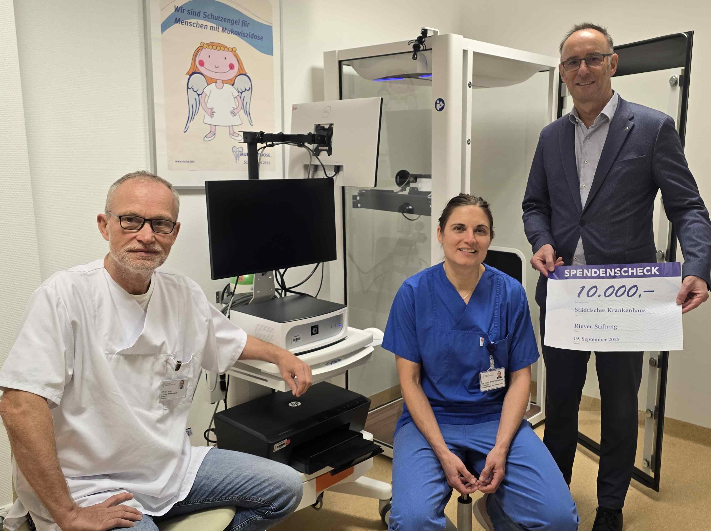 Große Freude heute im Städtischen Krankenhaus Kiel über eine 10.000 Euro Spende der Riever-Stiftung. Stiftungsvorstand Sönke Bergmann überreichte heute einen symbolischen Scheck und konnte unmittelbar sehen und erfahren wie das Geld investiert wurde, bzw. was damit noch Sinnvolles gemacht wird. „Wir sind sehr dankbar für die Spende der Riever-Stiftung, die anteilig in die Beschaffung eines dringend notwendigen Lungenfunktionsgerätes geflossen ist“, freut sich PD Dr. Tobias Ankermann, Chefarzt der Klinik für Kinder- und Jugendmedizin. Ein weiterer Teil der Spende wird in die Patientenaufklärung und medizinisches Equipment der Klinik für Akut- und Notfallmedizin investiert. „Dabei handelt es sich um Investitionen“, so Chefärztin Dr. Britta Raitschew, „die nicht gefördert werden, d.h. aus Eigenmitteln finanziert werden müssen. Die Spende hilft uns hier sehr!“ Sönke Bergemann, Vorsitzender der Riever-Stiftung, erklärte, „wir freuen uns, dass der Stifter uns mit dem Stiftungszweck die Möglichkeit gegeben hat, die medizinische Forschung zu unterstützen.“Foto (SKK): Vor dem neuen Lungenfunktionsgerät in der Kinderklinik: Chefarzt Kinderklinik PD Dr. Tobias Ankermann, Chefärztin Akut- und Notfallmedizin Dr. Britta Raitschew, Vorstand Riever-Stiftung Sönke Bergemann.