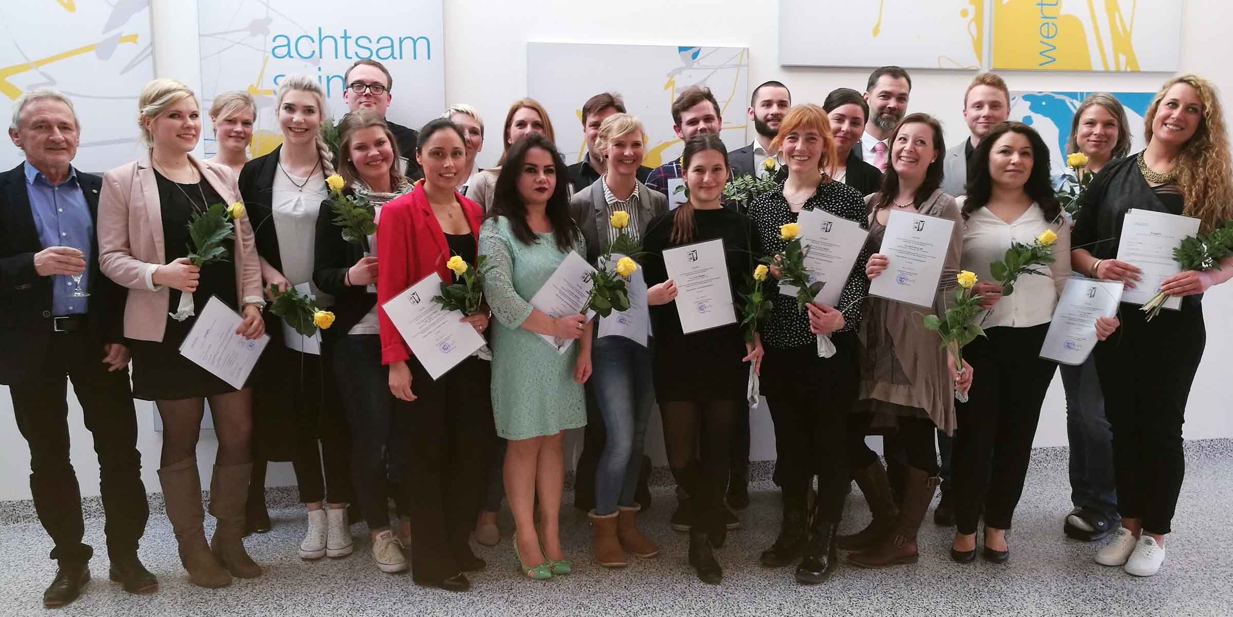 Bild: Ihre Examensurkunde in Händen halten (v. lks. nach re.): Stefanie Schlieszus, Katharina Tolksdorf, Kim-Christin Lütje, Mira Friedrich, Thomas Gerjets, Simone Taner, Bianca Jäger, Marjan Eslami, Susanne Wilhelm, Christoph Zychski, Christin Bachert, Sarah Kamrani, Pascal Baer, Lauritz Schewior, Jenny Ullrich, Justyna Oberzig, Remo Bandshoff, Merle Jeß, Robert Bornholdt, Sultan Demir, Anne Wronska, Claudia Schulz.