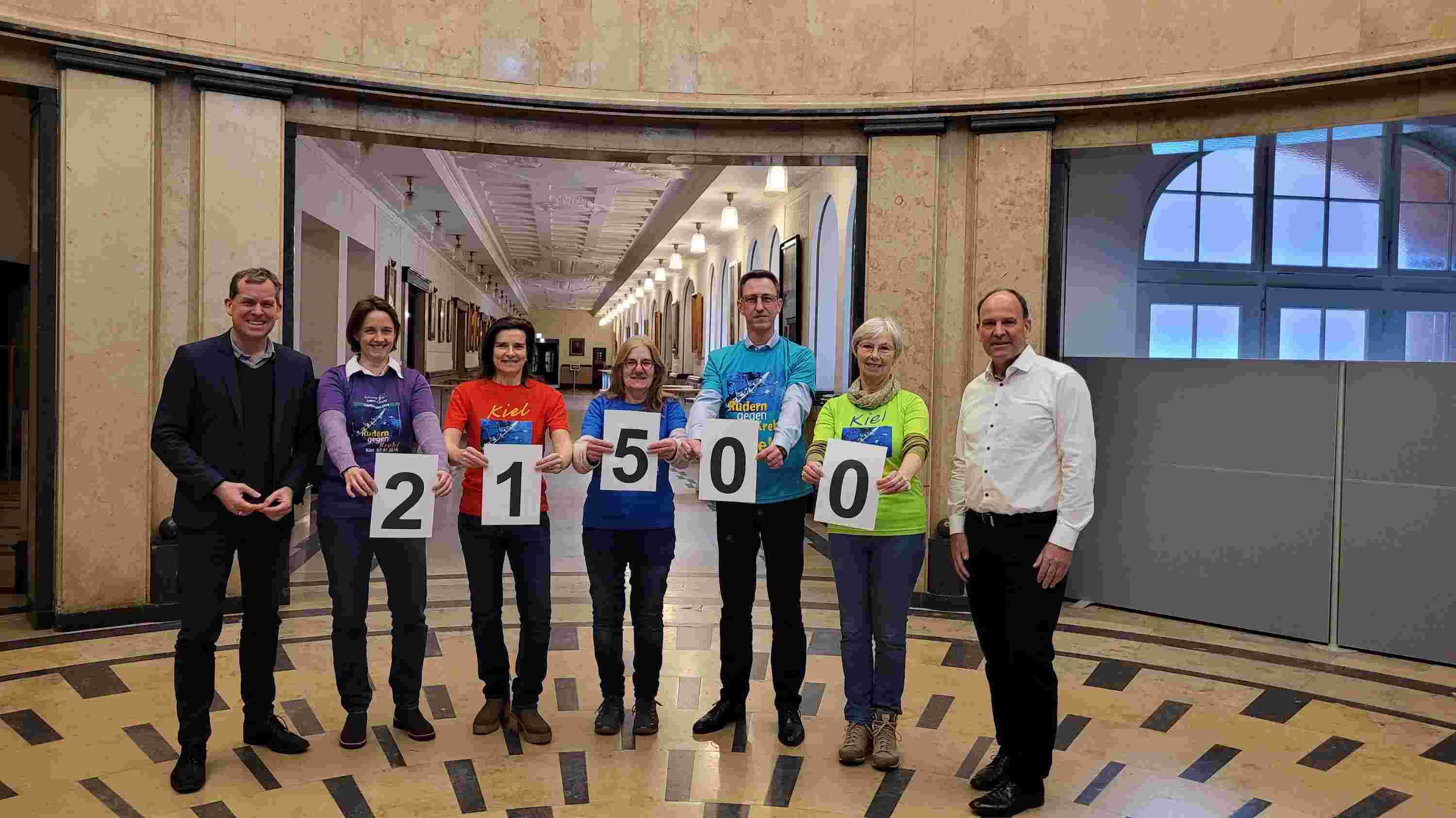 Mit der Benefizregatta „Rudern gegen Krebs“ wird das kostenlose bzw. stark kostenreduzierte Sportprogramm für Krebspatient*innen im Städtischen Krankenhaus Kiel finanziert. Es handelt sich um ein Kooperationsprojekt der bundesweit tätigen Stiftung Leben mit Krebs, den Kieler Rudervereinen (RG und EKRC) und den Schülerrudervereinen sowie dem Städtischen Krankenhaus Kiel. Im vergangenen Jahr erbrachte die Regatta einen Reinerlös fürs Städtische in Höhe von 21.500 Euro. Dieser Betrag wurde am 17. Januar symbolisch von Schirmherr Oberbürgermeister Dr. Ulf Kämpfer an das Therapiezentrum des Städtischen Krankenhauses übergeben. „Die Benefizregatta Rudern gegen Krebs hat sich über die Jahre für alle Beteiligten, ob Sponsoren, Kooperationspartner, Patient*innen und Teilnehmer *innen sowie Zuschauende zu einem traditionellen Sportevent entwickelt, das aus Kiel gar nicht mehr wegzudenken ist“, freut sich OB Dr. Ulf Kämpfer anlässlich der Scheckübergabe im Kieler Rathaus.