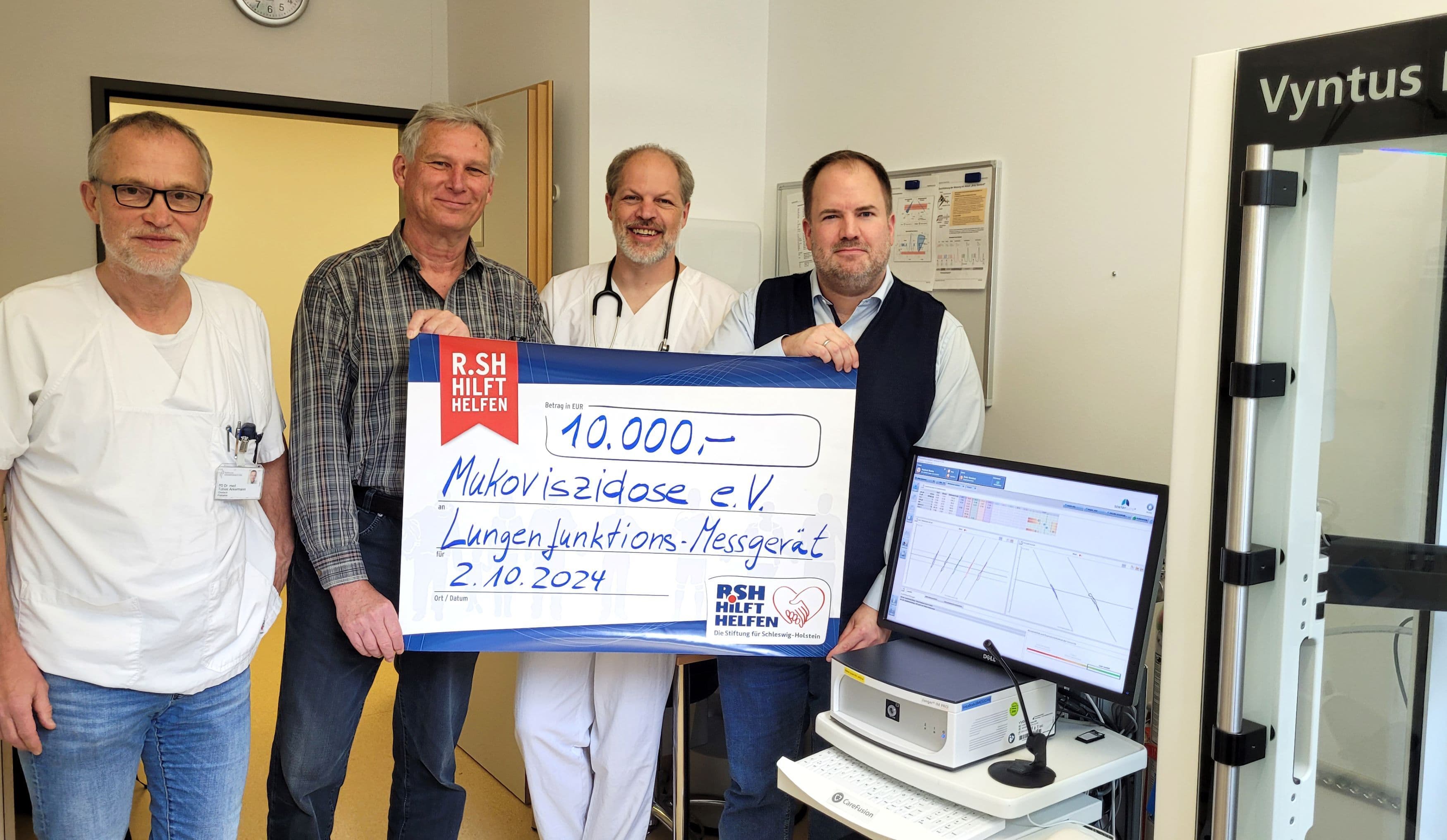 Dirk Klee, Vorstandsvorsitzender der R.SH hilft helfen-Stiftung, kam heute zur Freude von PD Dr. Tobias Ankermann, Chefarzt der Klinik- für Kinder- und Jugendmedizin, mit einem symbolischen 10.000 Euro Scheck ins Städtische Krankenhaus Kiel. Die Spende ist für ein neues Lungenfunktionsgerät, das in der Kinderklinik maßgeblich bei der Behandlung von Kindern und Jugendlichen mit Mukoviszidose eingesetzt werden soll, einer angeborenen unheilbaren Stoffwechselerkrankung. Zudem kommt das Gerät bei der Behandlung von Kindern mit Erkrankungen der Atemwege und Lunge im Rahmen des kinderpneumologischen Schwerpunktes der Klinik für Kinder- und Jugendmedizin des Städtischen Krankenhauses zum Einsatz.