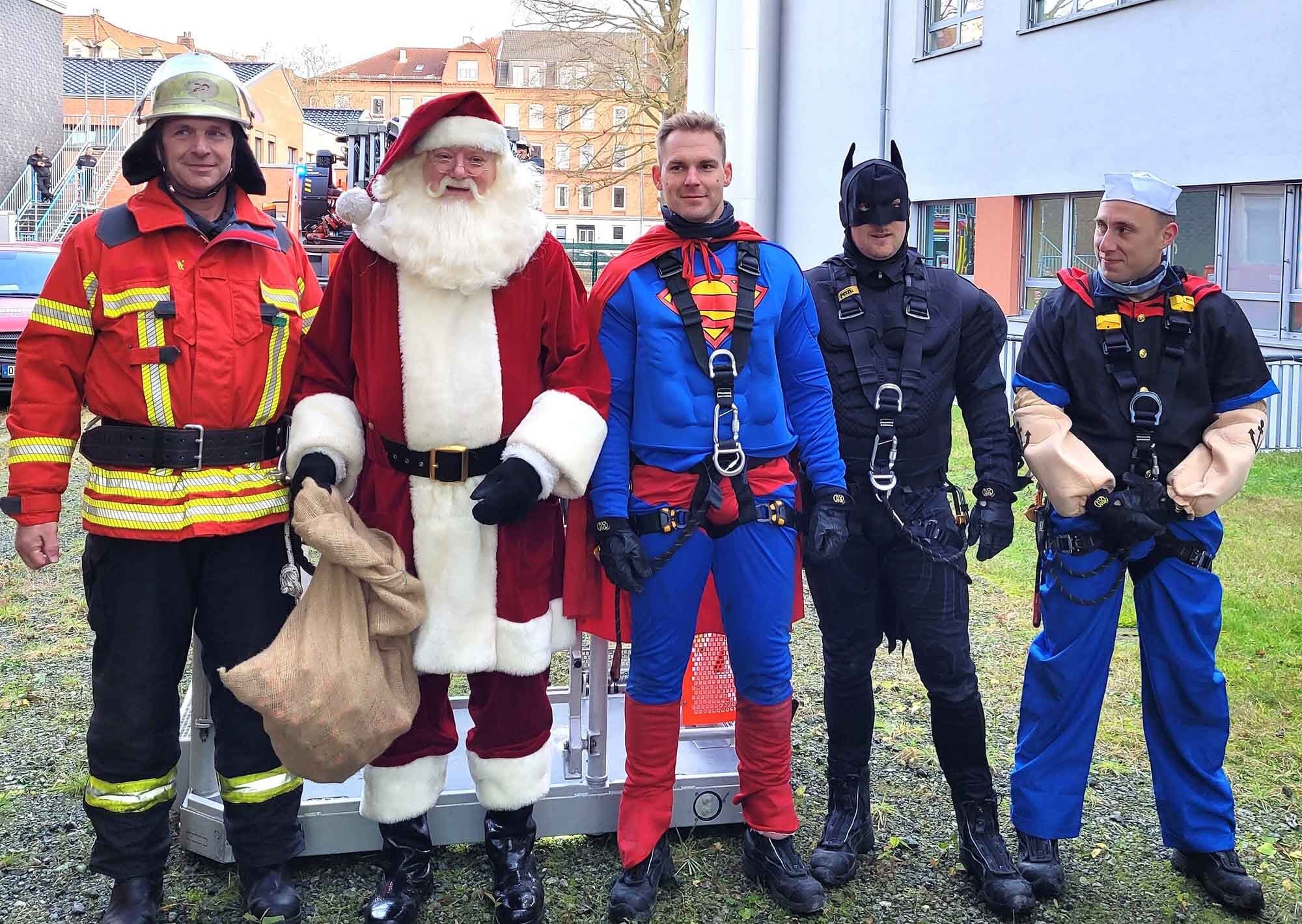 Erneut gab es einen außergewöhnlichen Einsatz für die Kieler Berufsfeuerwehr: Superhelden wie Batman, Popeye und Superman vollbrachten heute wahre Kunststücke; seilten sich vom Dach des Städtischen ab und sorgten dafür, dass mit ihnen der Weihnachtsmann wohlbehalten nach unten befördert wurde. Der sorgte für viel Freude bei den Kita-Kindern, die unten sehnlichst auf ihn warteten und Schoko-Weihnachtsmänner erhielten. Danach ging es für den Weihnachtsmann auf die Kinderstation, wo er ebenfalls freudig erwartet wurde und unterstützt von seinem „Superteam“ viele Geschenke verteilte.Der Feuerwehr Kiel ganz herzlichen Dank für diese superschöne Aktion!