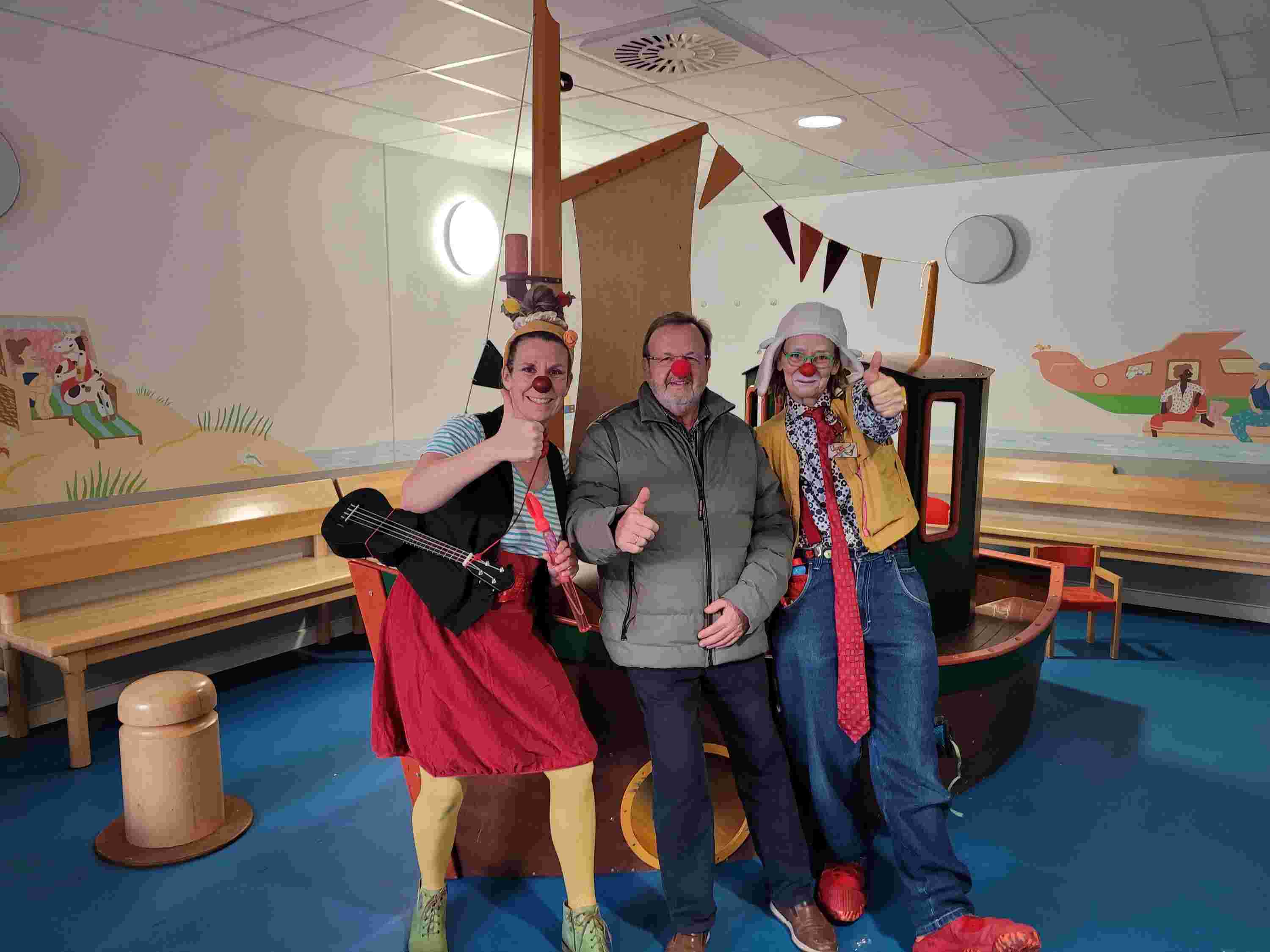 Zum 70. Geburtstag wünschte sich Wolfgang Ehresmann, im Bild mit den Klinikclown*innen Pauline(li.) und Upps (re.), statt Geschenke Spenden für die Klinikclowns im Städtischen. Dabei kamen wunderbare 490 Euro zusammen und wir danken sehr herzlich für diese fabelhafte Idee zugunsten der kleine Patient*innen im Städtischen!