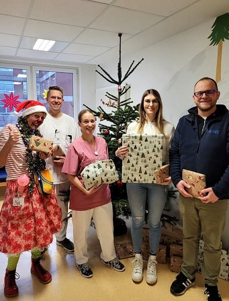 Klinikclownin Augustina, Oberarzt Dr. Niko Lorenzen und Teamleitung Janina Mohr freuten sich riesig über die Weihnachtsgeschenke Firma Heitec, die Emmilie Edborg und Martin Rüprich überbrachten. Gedacht als Trost für die Kinder, die über die Weihnachtstage stationär aufgenommen werden müssen.