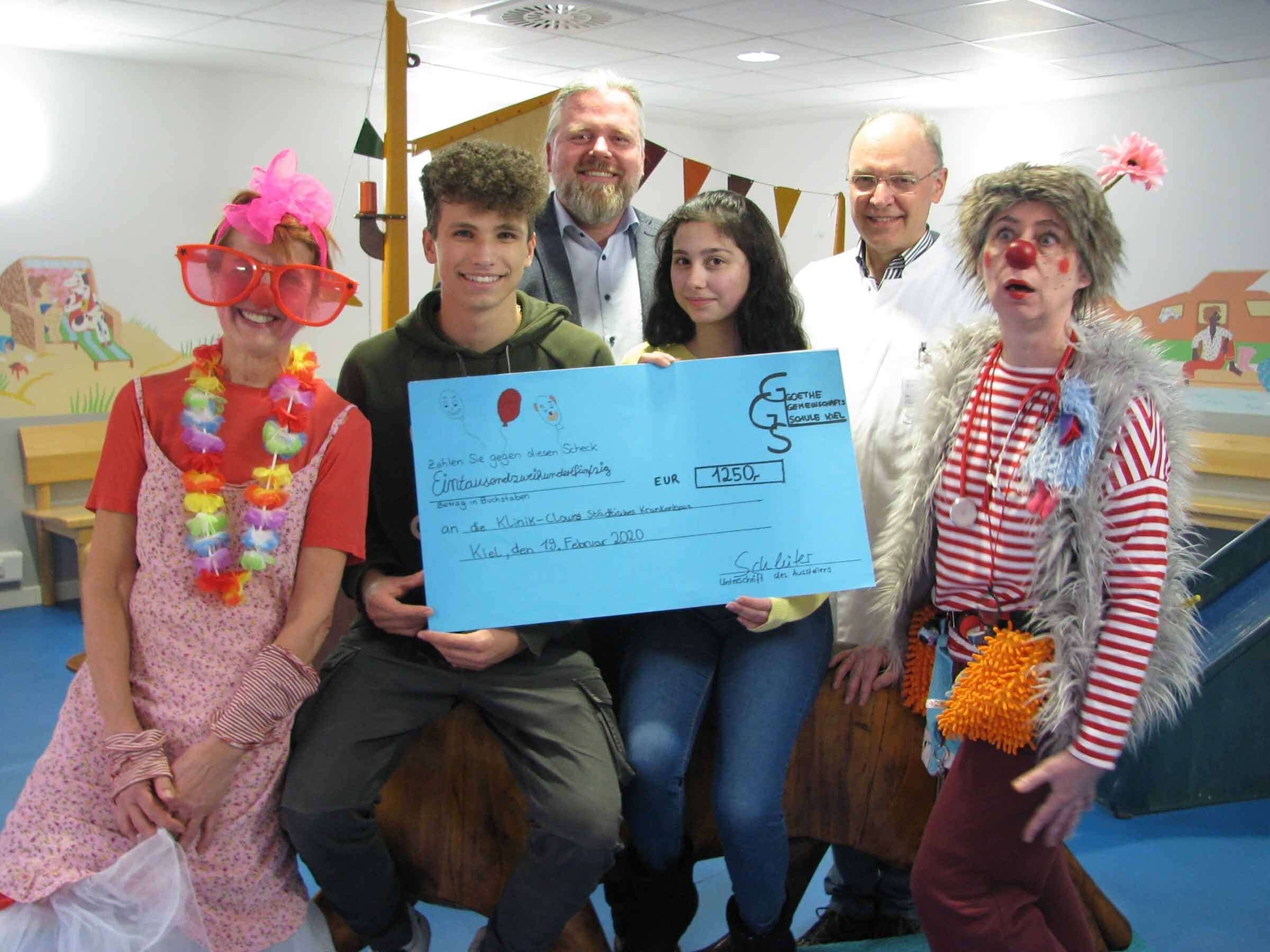 Große Freude darüber bei den Klinikclowns Augustina (li) und Flokati (re.) sowie Chefarzt PD Dr. Andreas Claaß. Lennet Ritzheim, 2. v. li. und Seray Birici begleiteten ihren Schulleiter stellvertretend für alle die zu diesem Superergebnis beigetragen haben!