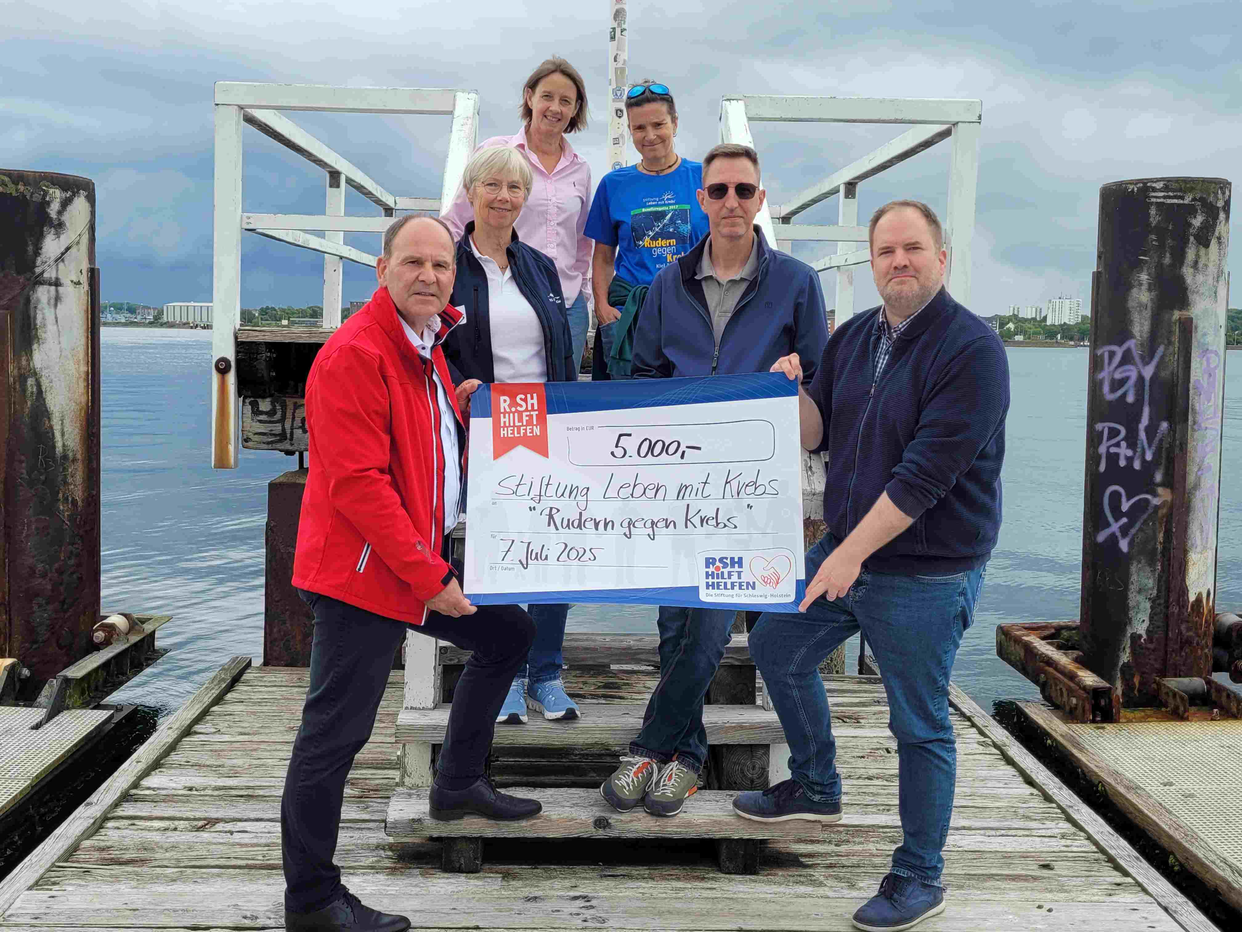 Dirk Klee, Vorstand der R.SH hilft helfen Stiftung hat zugunsten der Benefizregatta „Rudern gegen Krebs“ am 7. Juli einen 5000 Euro Scheck an SKK-Geschäftsführer Dr. Roland Ventzke überreicht. „Wir freuen uns sehr, dass die R.SH hilft helfen Stiftung bei diesem wichtigen Kieler Sportevent wieder dabei ist“, so Dr. Roland Ventzke. „Wir benötigen diese Unterstützung, damit das kostenlose bzw. stark kostenreduzierte Sportprogramm für Krebspatient*innen im Städtischen weiter angeboten werden kann. Das Benefizevent unter Schirmherrschaft von OB Dr. Ulf Kämpfer wird am 19.7. in Kooperation mit der Stiftung Leben mit Krebs, dem Städtischen Krankenhaus Kiel, dem Ersten Kieler Ruderclub von 1882 e.V. (EKRC), der Rudergesellschaft Germania (RGG) und dem Verband der Kieler Schüler Rudervereine (VKSR) an der Kiellinie ausgetragen. "Wir unterstützen mit der R.SH hilft helfen Stiftung sehr gerne die wertvolle Arbeit des Städtischen Krankenhauses Kiel und der Initiative "Rudern gegen Krebs", betonte Klee. „Wir wissen, dass die Spende der R.SH-Hörerinnen und Hörer hier in allerbesten Händen ist, um wichtige therapeutische Maßnahmen im Kampf gegen Krebs anbieten zu können. Dem ganzen Team und allen Teilnehmenden wünschen wir eine erfolgreiche Benefizregatta."Das Sportangebot im Städtischen gilt für alle Krebspatient*innen, unabhängig davon in welcher Klinik sie behandelt wurden. Gleiches gilt für das Rudertraining durch die Rudergesellschaft Germania 1882 e.V. Sportwissenschaftlerin und Physiotherapeutin Astrid Schulz bietet das Sportprogramm im SKK an, u.a. mit Kursen zur Funktionellen Bewegungstherapie, Aquafit, Pilates, Entspannung und Physiotraining. Wer interessiert ist, meldet sich gerne bei Astrid Schulz unter Tel.: 0431-1607-3360 oder astrid.schulz@krankenhaus-kiel.deFoto von unten li. n.re.: SKK Geschäftsführer Dr. Roland Ventzke, Vorstand R.SH hilft helfen Stiftung Dirk Klee2. Reihe: Sabine Köhler, RGG; Andreas Harm, EKRC; oben: Maja Darmstadt, VKSR; Astrid Schulz, Leitung SKK-Sportprogramm für Krebspatienten