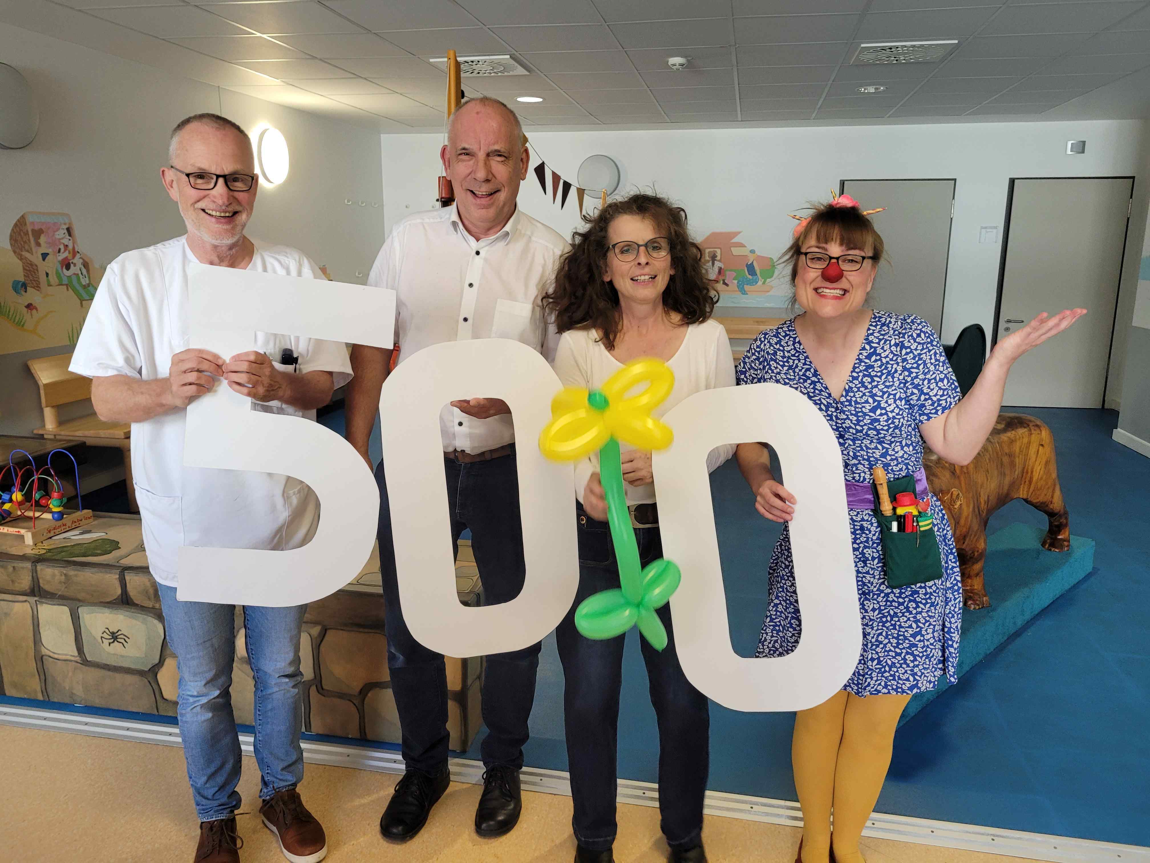 Angelika Meier und Peter Hese vom Pop- und Gospelchorvorstand Rückendwind aus Flintbek kamen heute zu Besuch in die Kinderklinik des Städtischen um von ihrem Konzert zugunsten der Klinikclowns zu berichten. 500 Euro sind für die Auftritte der Improvisationskünstler zusammengekommen. Klinikclowns Julie und auch Chefarzt PD Dr. Tobias Ankermann kamen für diesen Fototermin vorbei und dankten ganz herzliche für diese tolle Aktion! Foto: SKKvon li.n.re.: Chefarzt Kinderklinik PD Dr .Tobias Ankermann, Vorstand Pop- und Gospelchor Flintbek Peter Hese und Angelika Meier und Klinikclown Julie