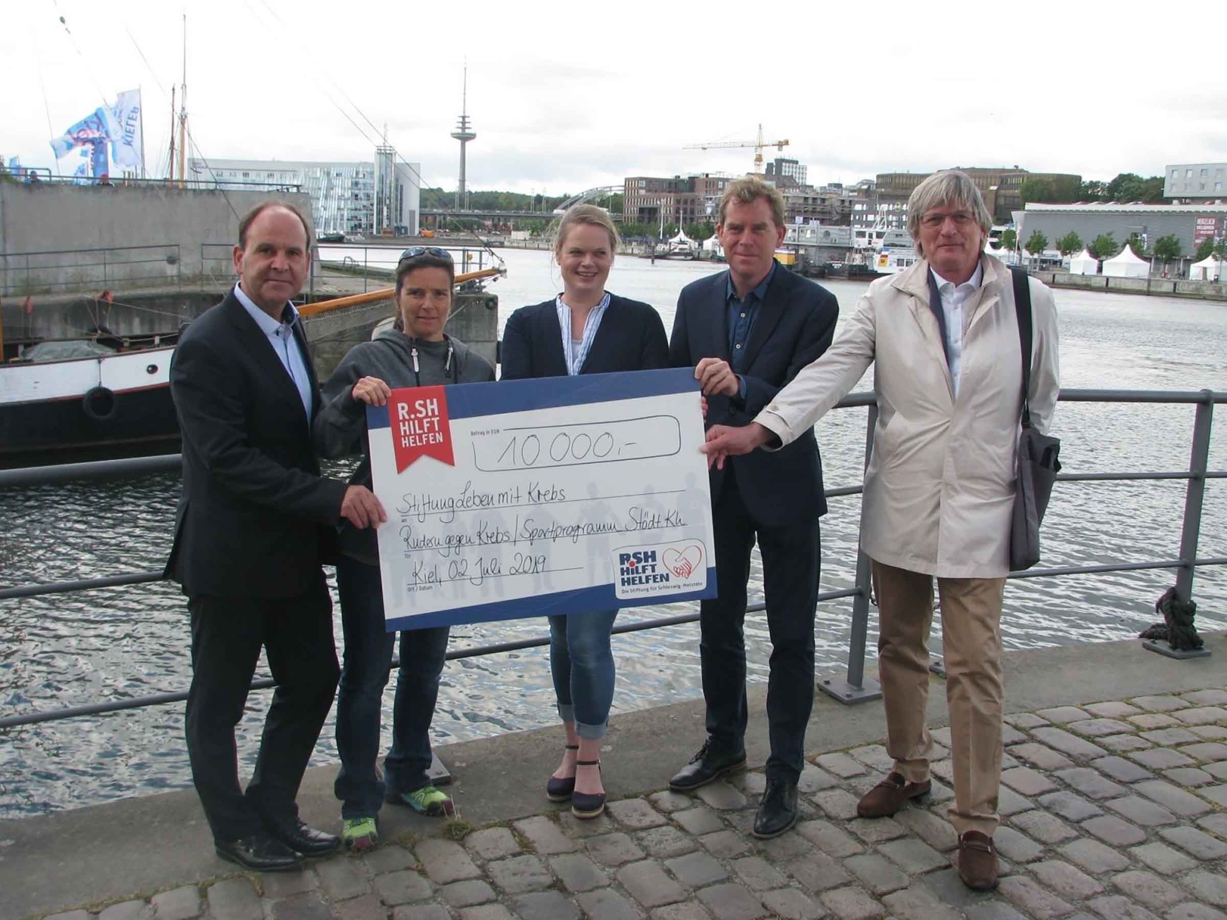 Friderike Aderhold, Stiftungsmanagerin der R.SH hilft helfen Stiftung (Bild 3.v.li.), hat der Stiftung Leben mit Krebs einen 10.000 Euro Scheck für das größtenteils kostenlose oder stark kostenreduzierte Sportprogramm für Krebspatienten im Städtischen Krankenhaus Kiel übergeben.