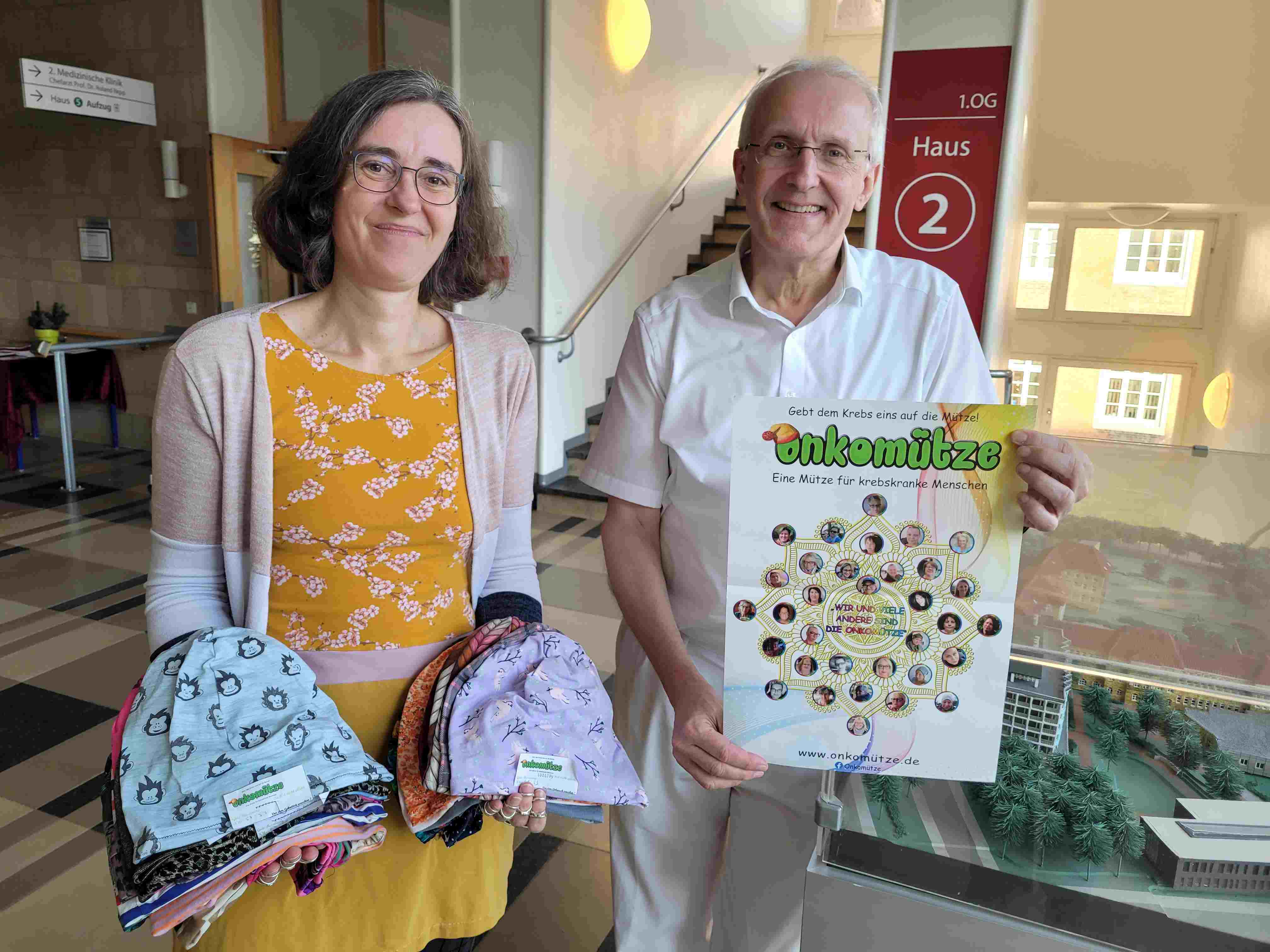War das eine freudige Überraschung, als Stefanie Bohn von der Interessengemeinschaft Onkomützen kürzlich mit einem Paket bunter Mützen ins Städtische Krankenhaus kam und diese Prof. Roland Repp, Chefarzt der 2. Medizinischen Klinik für Onkologie, überreichte. Wir sagen ganz herzlichen Dank und freuen uns unseren Patient*innen diese maßgeschneiderte kostenlose Kopfbedeckung bei durch Chemotherapie bedingten Haarausfall überreichen zu können. Sie sind nicht nur Kopfbedeckung, sondern auch ein Zeichen der Solidarität.